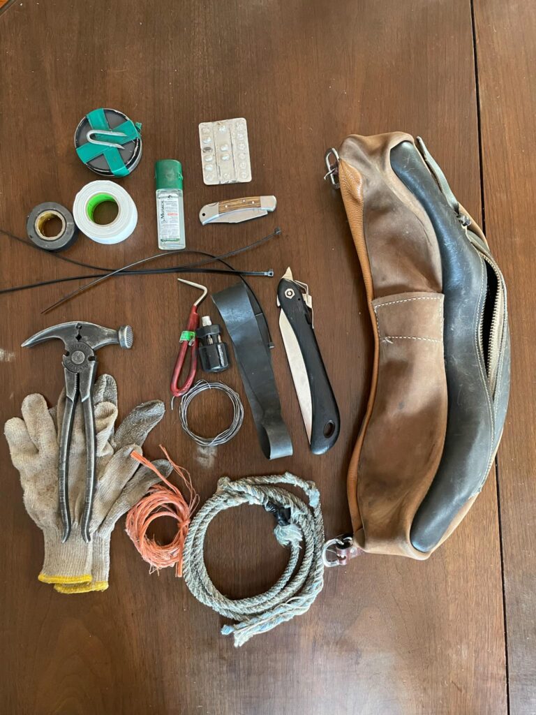 “This cantle bag stays on my saddle at all times,” says Hiller. “And these are items I keep in that bag all year-round.”