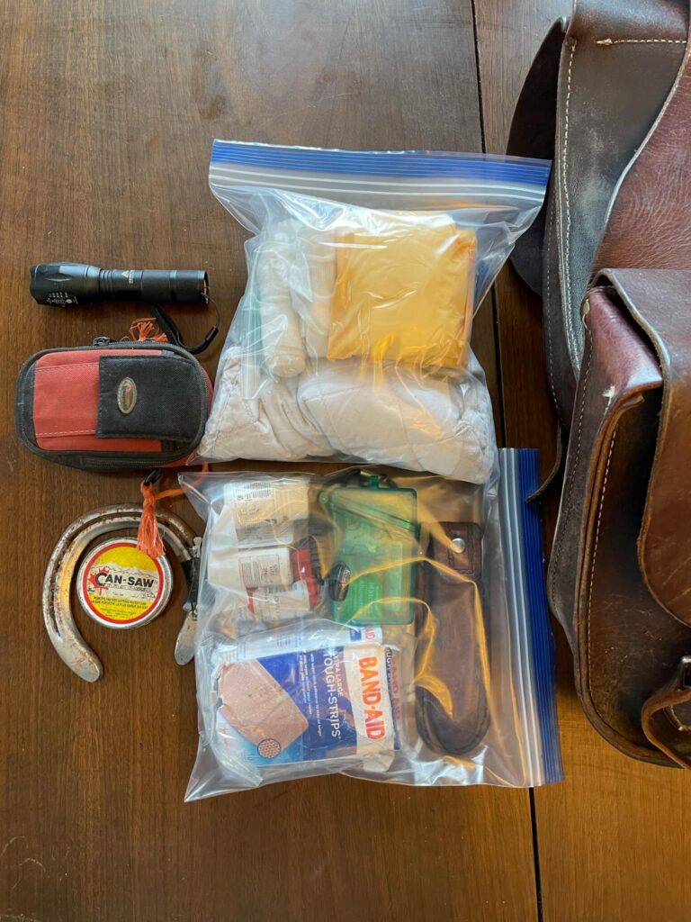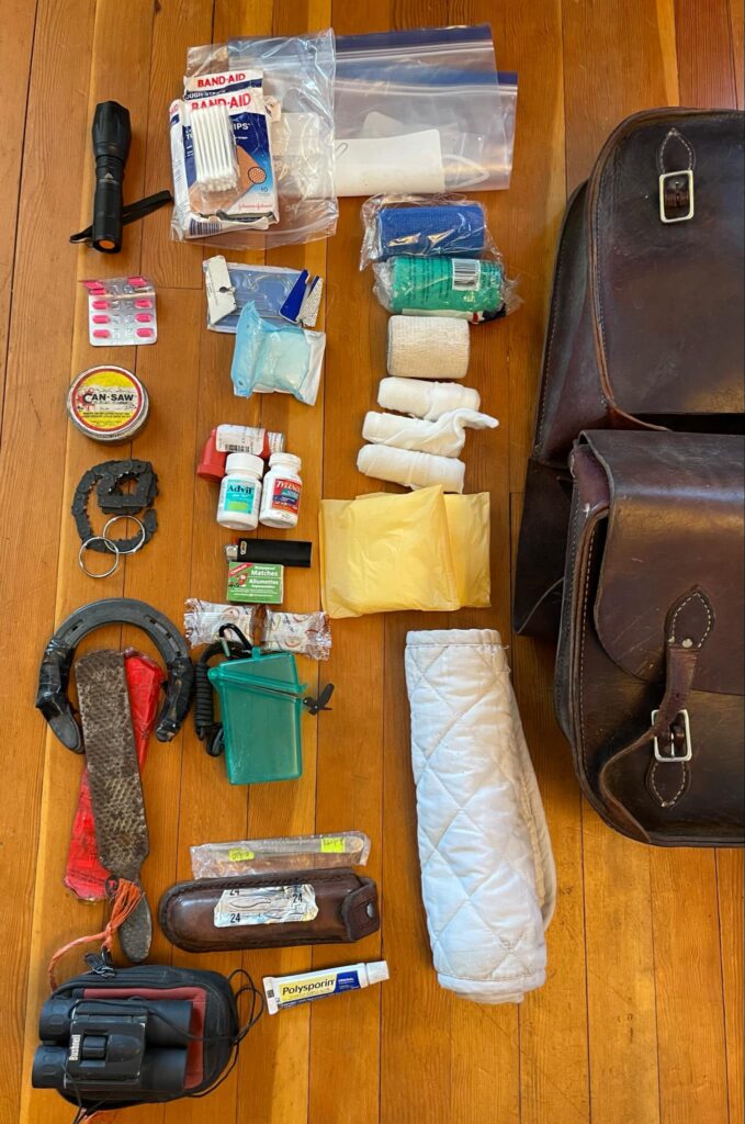 With years of experience pushing cattle in remote areas, the safety items in Hiller’s packs are non-negotiable. On long rides, he knows it’s possible for riders to encounter wildlife hazards, equipment failure, navigation errors , allergic reactions and heat stroke. Horses too, can throw a shoe mid-ride, get tangled in the brush, become lame – or, spook and run off, with or without their rider in the saddle.