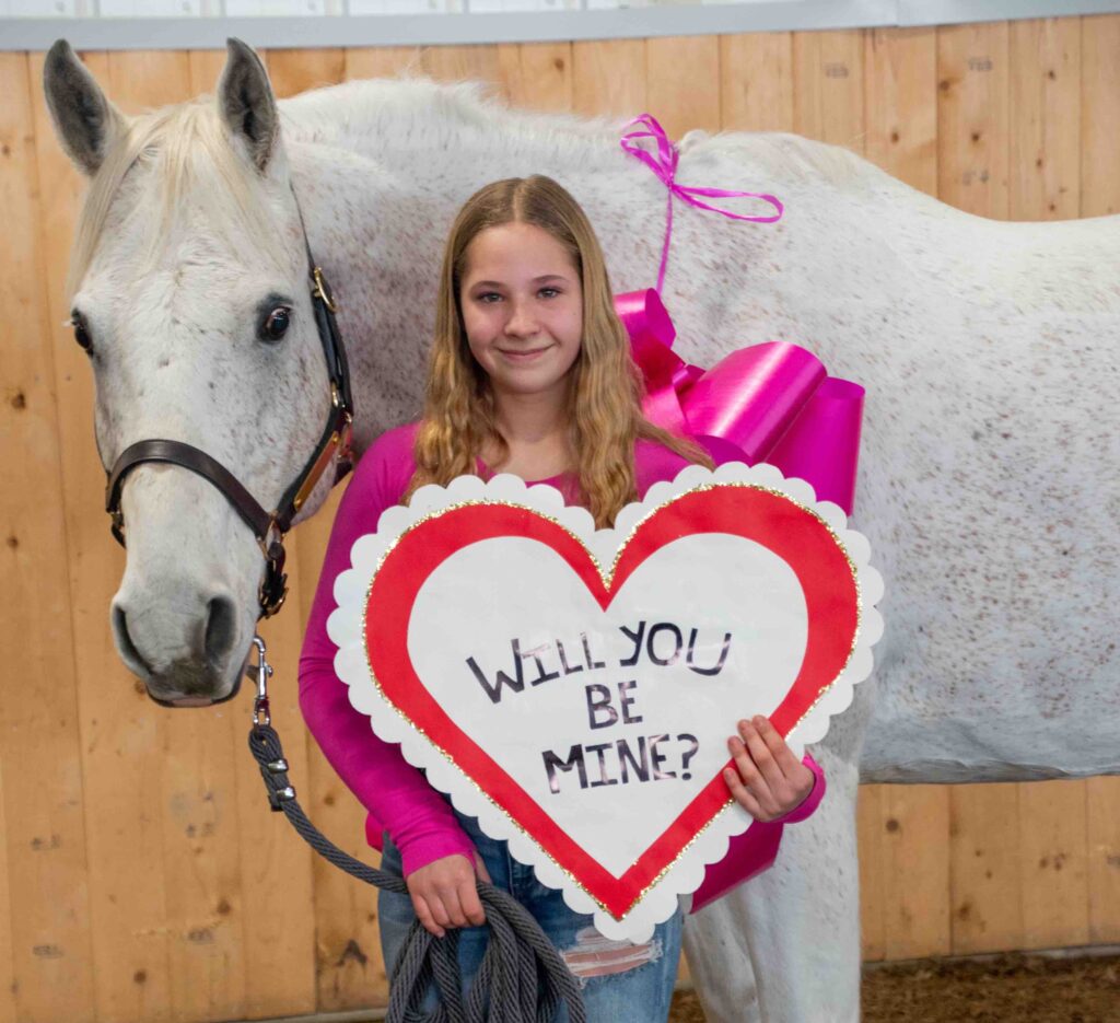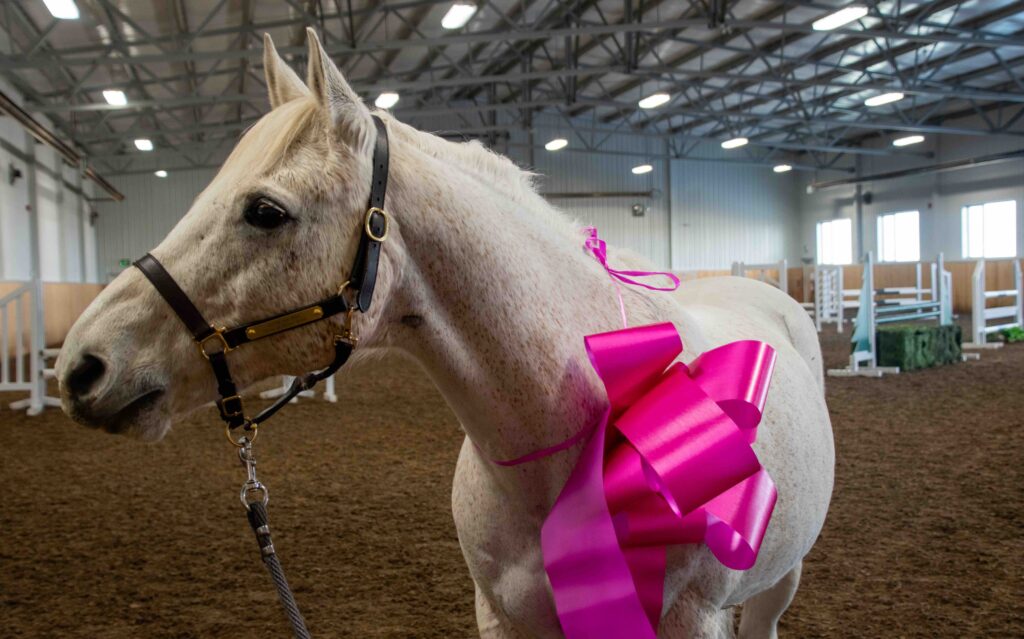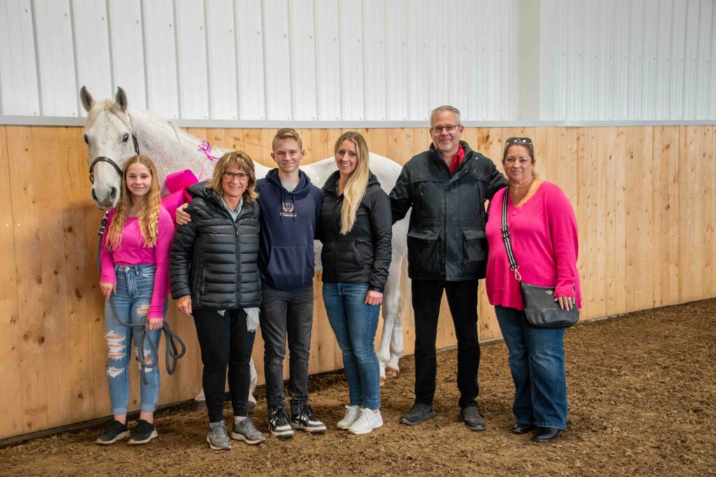 Earlier today, Blue’s auction saviours gifted the horse to Sienna in a surprise gathering. Wearing a bright pink bow and a newly engraved name-plate on his halter, Kowalenko and Rochon handed Blue’s halter shank over to his new owner.