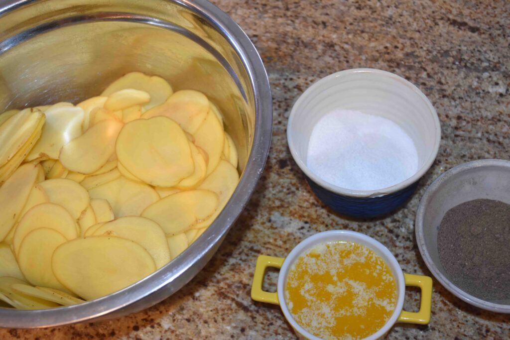 2) Using a mandolin, slice the potatoes lengthwise to about 1/16th of an inch.