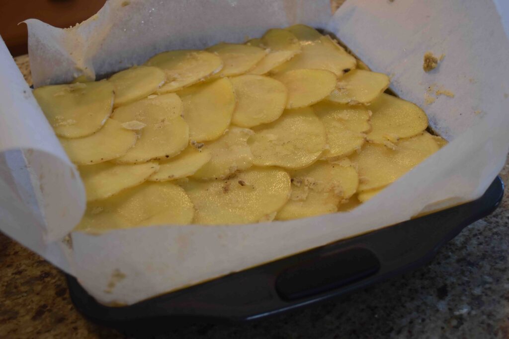 4) In a loaf pan, lay down the potato piece by piece. Evenly layer until all the potatoes are used.