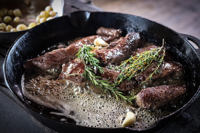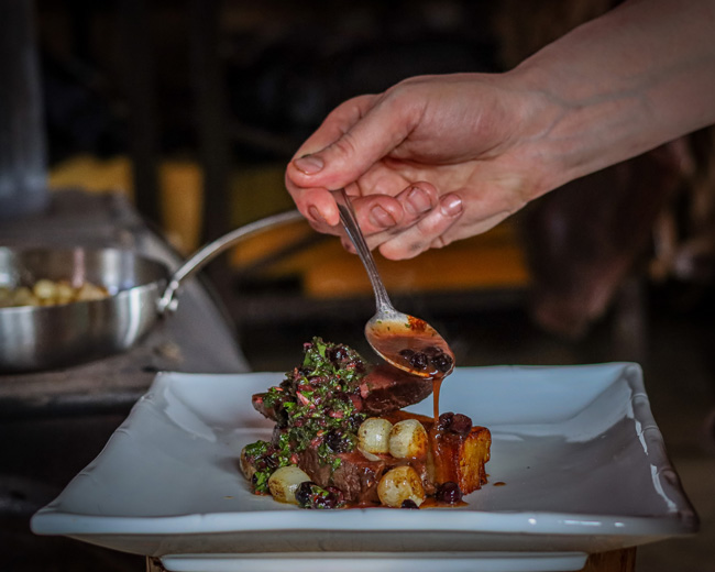 Cook the venison via your preferred method and to your preferred doneness. For this dish we used the tenderloin and seared it at high heat to an internal temperature of 125-degrees Fahrenheit (rare). Then we allowed the meat to rest, covered for 15 minutes.
